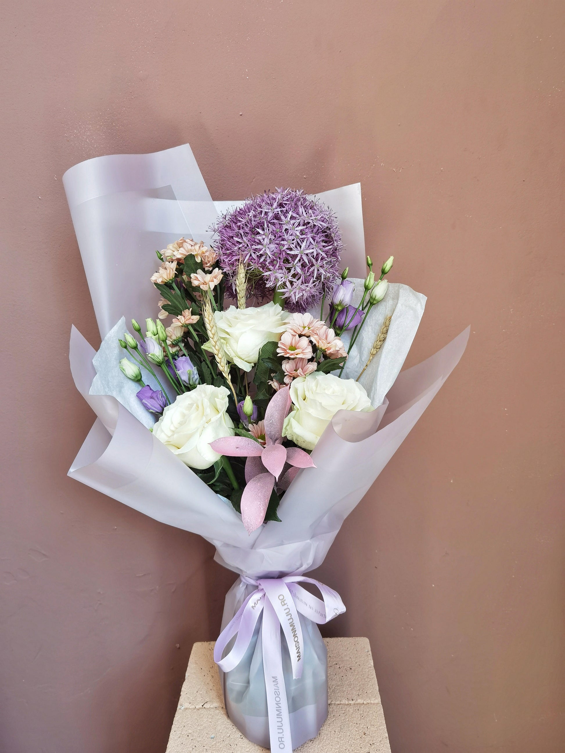 Un buchet diafan și rafinat, compus din flori albe și mov deschis, creat pentru momentele care cer delicatețe și echilibru. Albul transmite puritate și simplitate, în timp ce nuanțele pale de mov adaugă o notă subtilă de romantism și mister. Fie că este oferit în semn de afecțiune, mulțumire sau gânduri senine, acest buchet este o alegere ideală pentru a transmite emoții sincere, fără cuvinte.
