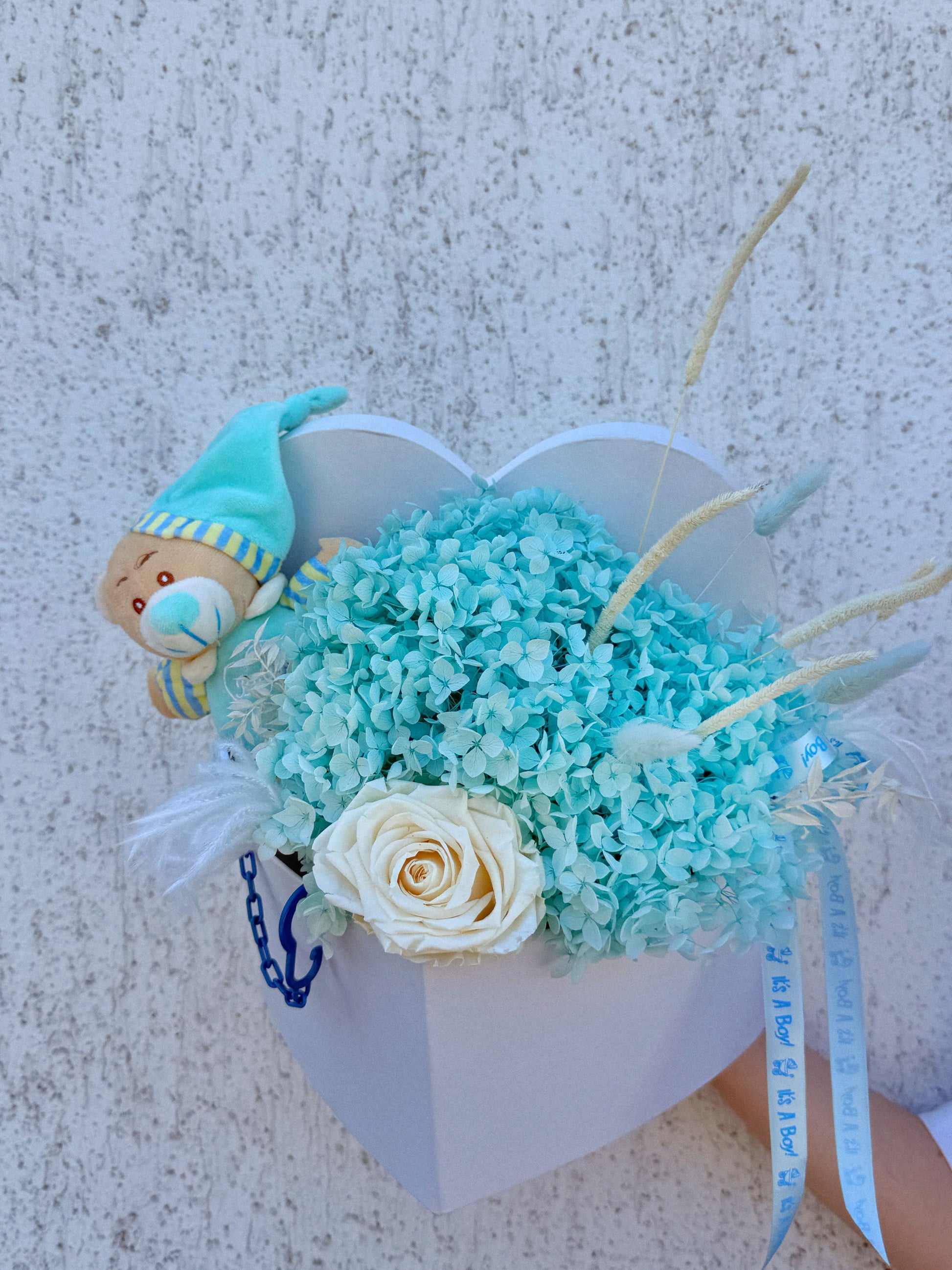 Un dar plin de gingășie și emoție, acest aranjament cu flori criogenate este creat special pentru a celebra venirea pe lume a unui bebeluș și bucuria unei mămici. În nuanțe delicate de roz pentru fetițe sau albastru pentru băieței, fiecare floare este naturală și stabilizată pentru a rămâne frumoasă ani la rând – asemenea amintirilor de neuitat din primele zile de viață.