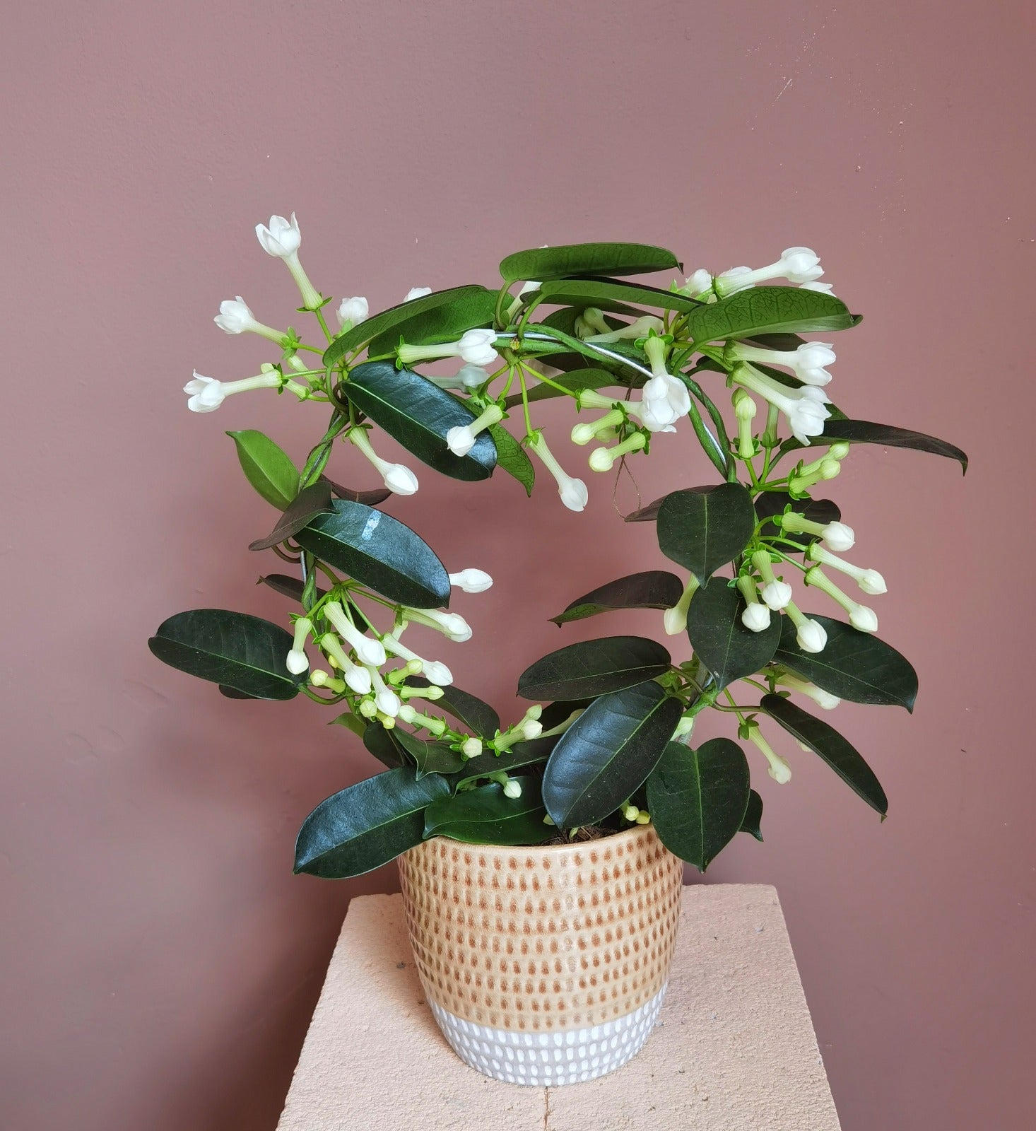 Stephanotis este o plantă elegantă, apreciată pentru florile sale albe, parfumate și delicate, care aduc un aer romantic și proaspăt în orice încăpere.